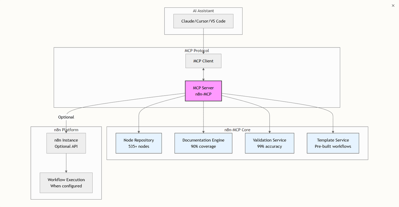 你可以把它理解成,给AI助手(比如Claude)提供了一本n8n的完整“使用手册”。这本手册不是几篇文档抄抄写写,而是硬核的数据支撑:它覆盖了n8n全生态的535个以上的节点,其中99%的节点属性和90%的官方文档都被结构化地收录了进来。