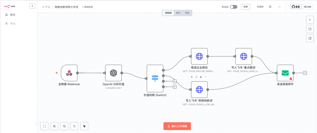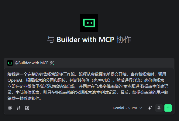 我的指令: “给我建一个完整的销售线索流转工作流。流程从金数据表单提交开始。当有新线索时,调用OpenAI,根据线索的公司和职位,判断其价值(高/中/低)。然后进行分流:高价值线索,立即在企业微信里推送消息给销售总监,并同时在飞书多维表格的'重点跟进'数据表中创建记录。中低价值线索,则只在多维表格的'常规线索池'中创建记录。最后,给提交表单的用户邮箱发一封感谢邮件。”