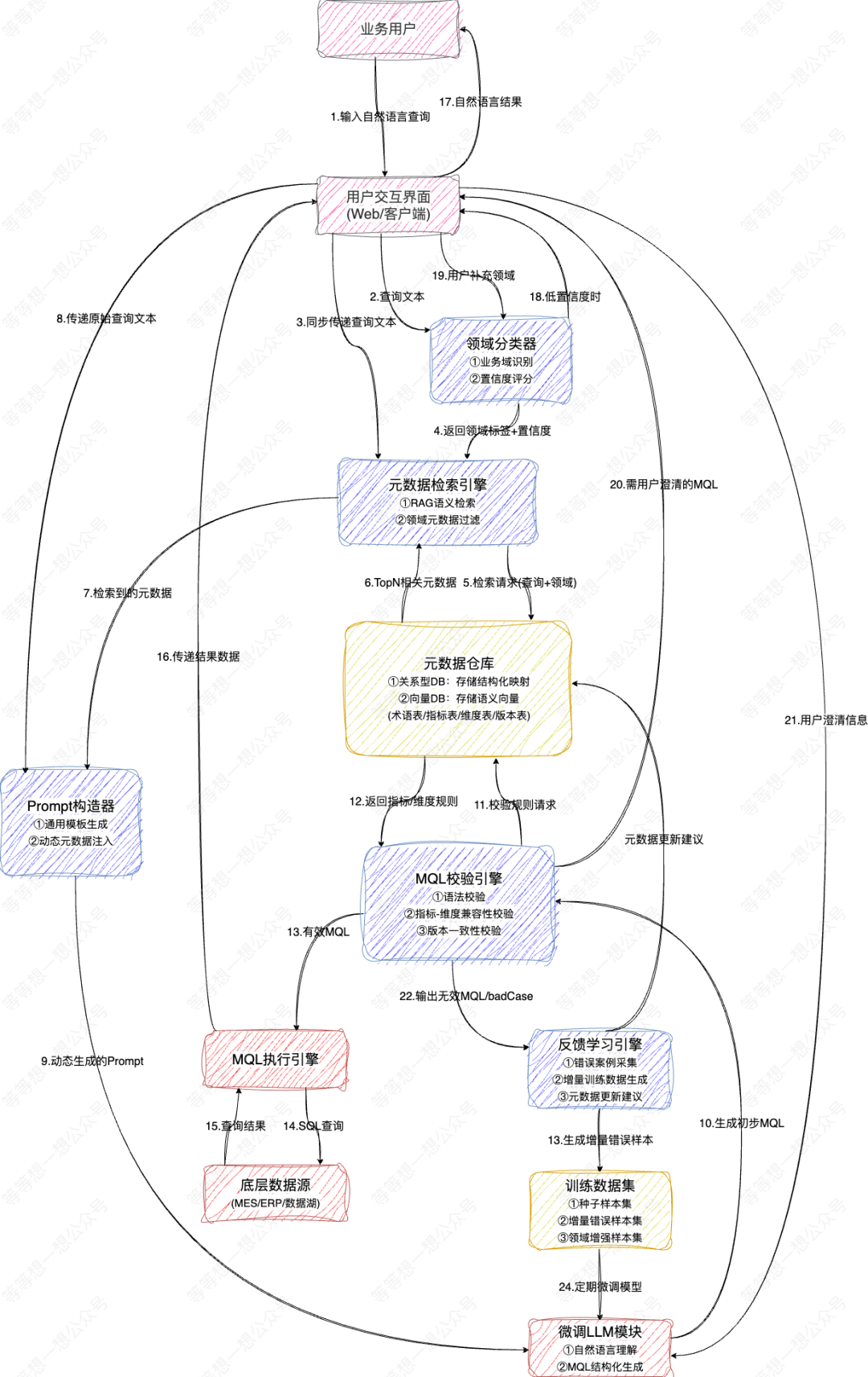 13-17步执行与结果返回:校验通过的MQL经MQL引擎转换为SQL,查询底层数据源后,结果通过UI以自然语言形式返回给用户。