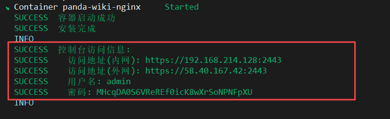 SUCCESS 控制台访问信息: SUCCESS 访问地址(内网): https://192.168.214.128:2443 SUCCESS 访问地址(外网): https://58.40.167.42:2443 SUCCESS 用户名: admin SUCCESS 密码: MHcqDA0S6VReREf0icK8wXrSoNPNFpXU