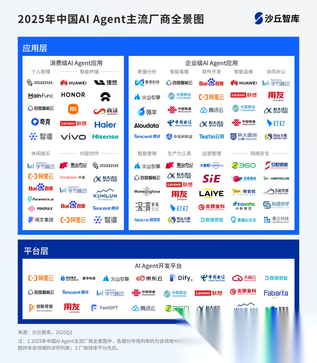 在《2025年中国AI Agent主流厂商市场指南》中,沙丘智库精心绘制了「中国AI Agent主流厂商全景图」,帮助从业者快速了解AI Agent产业全貌。