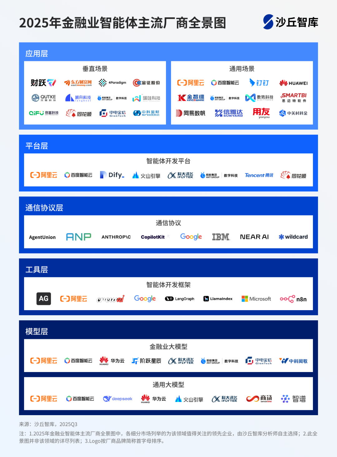 垂直到金融领域,在《2025年金融业智能体主流厂商市场指南》中,沙丘智库绘制金融业智能体主流厂商全景图,帮助企业用户选择更适合的产品/解决方案。