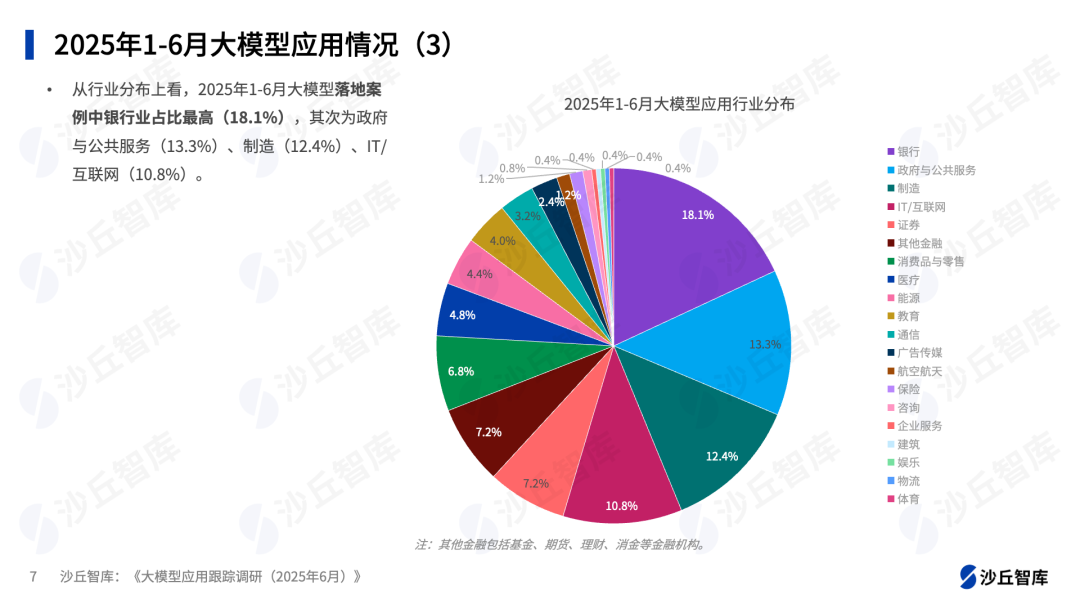 从行业分布上看,2025年1-6月大模型落地案例中银行业占比最高(18.1%),其次为政府与公共服务(13.3%)、制造(12.4%)、IT/互联网(10.8%)。
