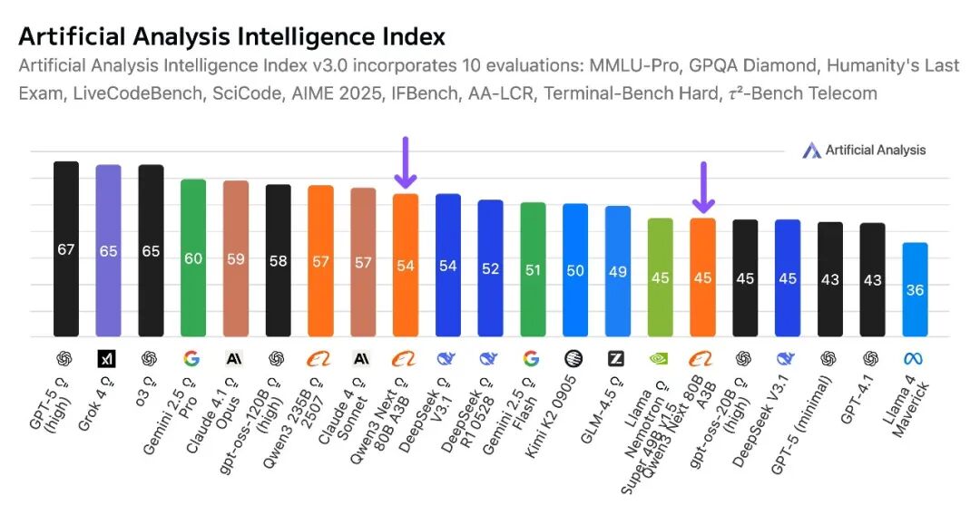 Qwen 3-Next 主要实现了模型计算效率的重大突破,总参数80B仅激活 3B,性能就可足以媲美千问3旗舰版235B模型。