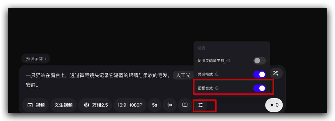 其中,要想视频能生成声音,需要手动开启一下这个音效设置: