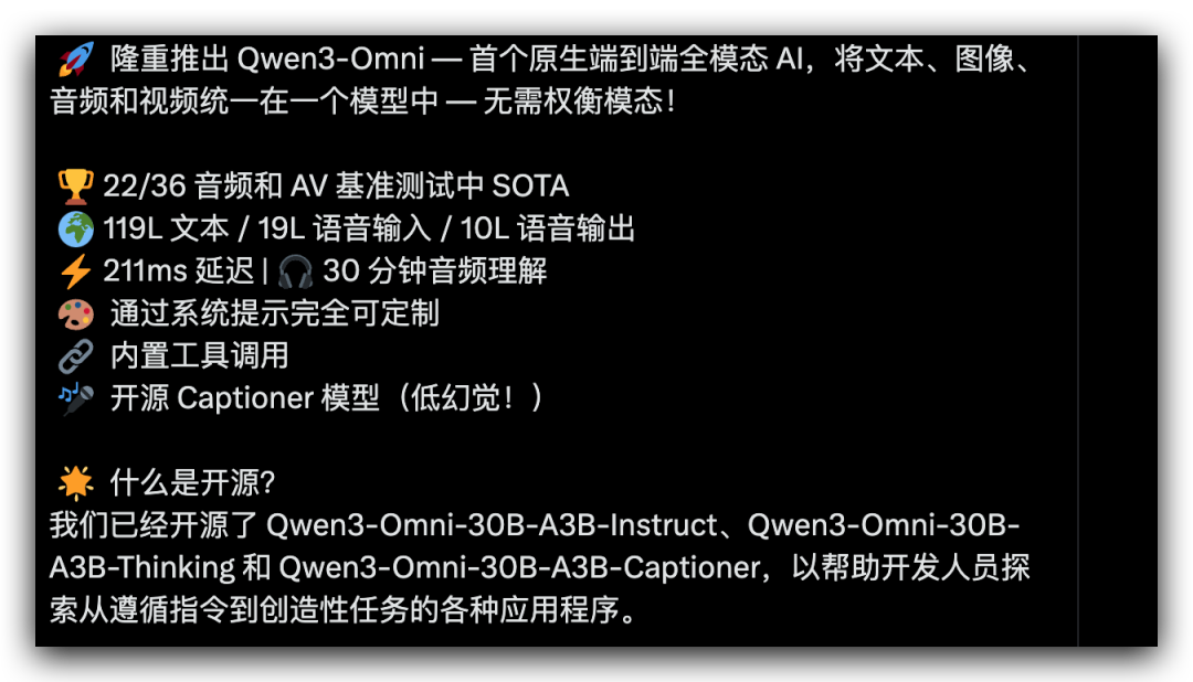 目前已经开源了 Qwen3-Omni-30B-A3B-Instruct、Qwen3-Omni-30B-A3B-Thinking 和 Qwen3-Omni-30B-A3B-Captioner。