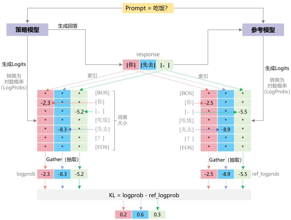 策略模型和参考模型的输出分别是红色和绿色区域的logits,它们的值有偏差。例如,模型A在生成“你”这个词时,logit值为-2.3,而参考模型的值为-2.5,这一差异会被用于计算KL散度的贡献。这里类似损失函数的计算,最终算出两个概率分布的差异数值为0.2、0.6、0.3,表示了策略模型生成的logits与参考模型之间的差异程度。