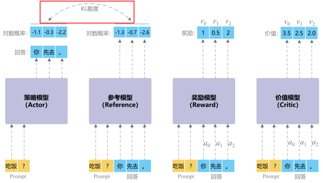 先看下面的图片,这幅图是典型的PPO强化学习算法的工作场景,包含策略模型(要训练的模型)、参考模型(防止过度偏离预期)、奖励模型(对模型当前状态的行为做奖励)和价值模型(当前动作对远期行为的一个影响)