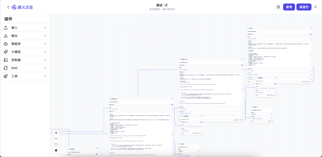可编排则体现在对复杂业务流程的支持上。金融业务很少是单一任务,往往需要多个环节协同。比如企业贷款审批,需要先进行资质审查,然后评估财务状况,接着分析行业风险,最后给出授信建议。通义点金支持将多个智能体和工具编排成工作流,每个环节可以由不同的专门模型负责,确保专业性的同时保持流程的连贯性。