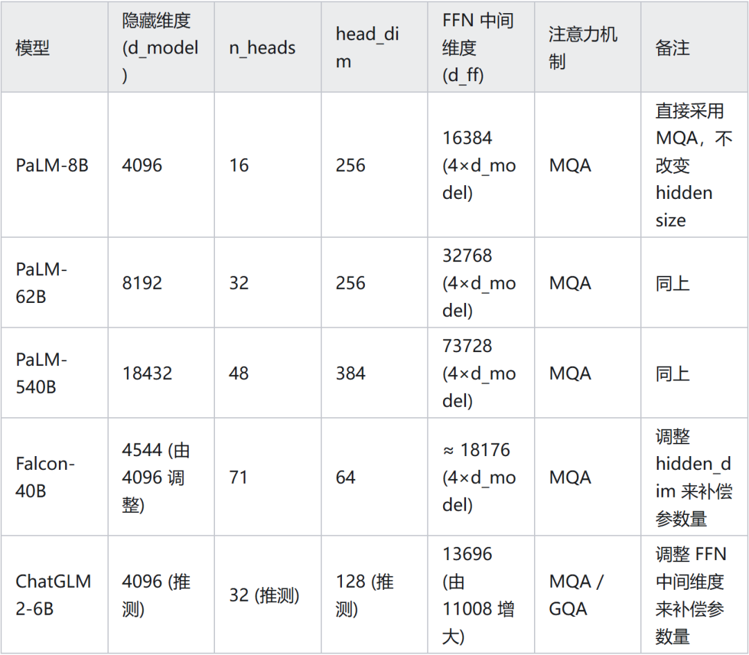 ChatGLM2-6B:采用 MQA / GQA 混合策略,将 FFN 中间维度从 11008 增加到 13696,多余参数分配给 FFN。