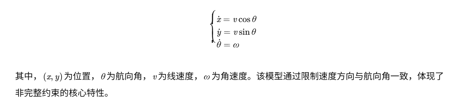 - 非完整约束建模:利用独轮车模型简化系统动力学,降低路径规划复杂度;