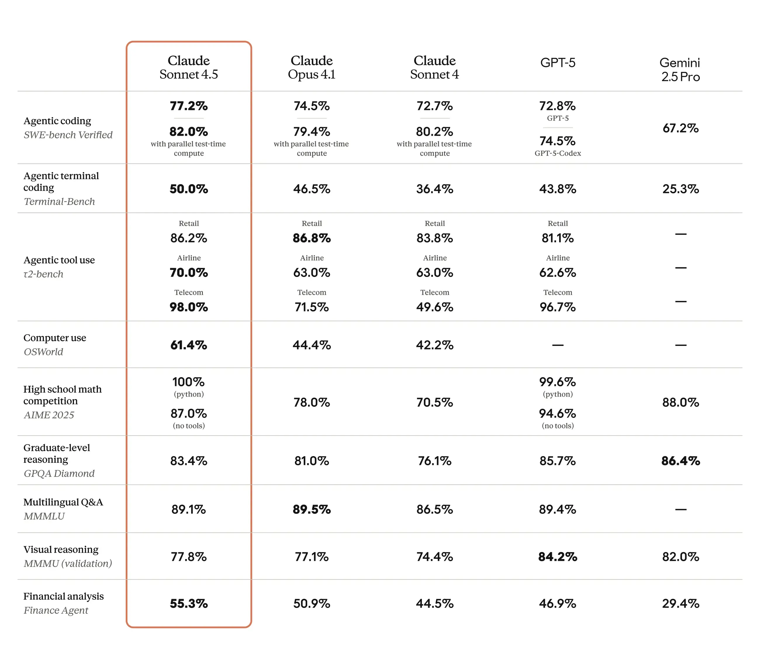 Claude Sonnet 4.5 在多个关键基准测试中展现了其卓越的性能,尤其是在编码和智能体任务方面。