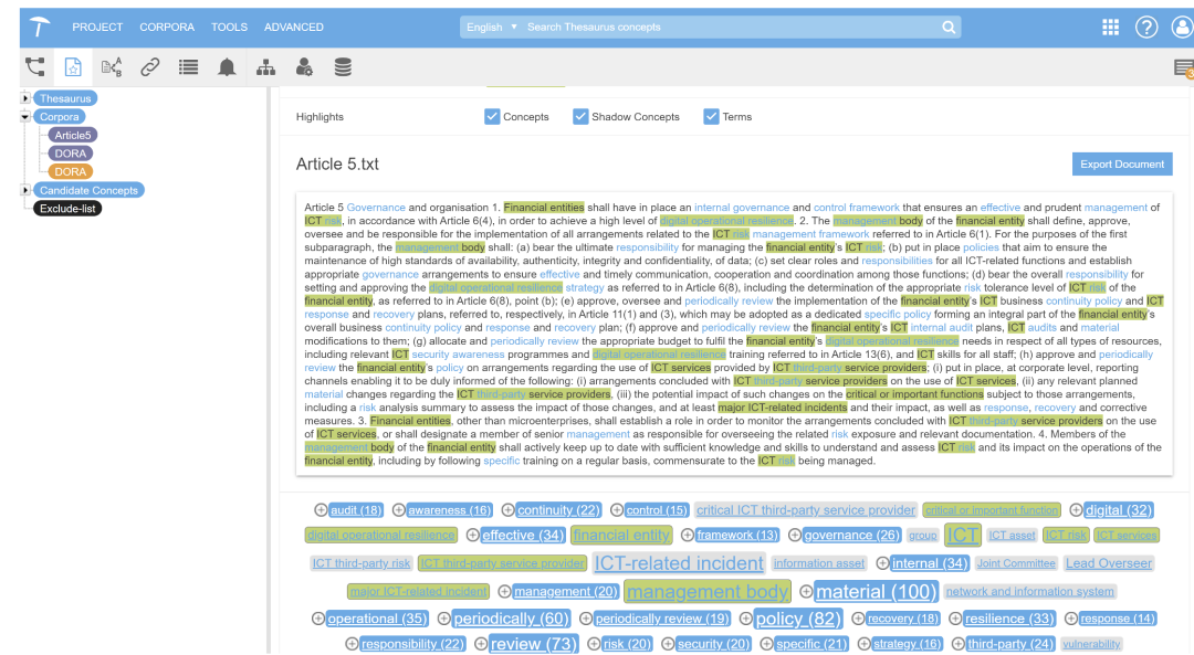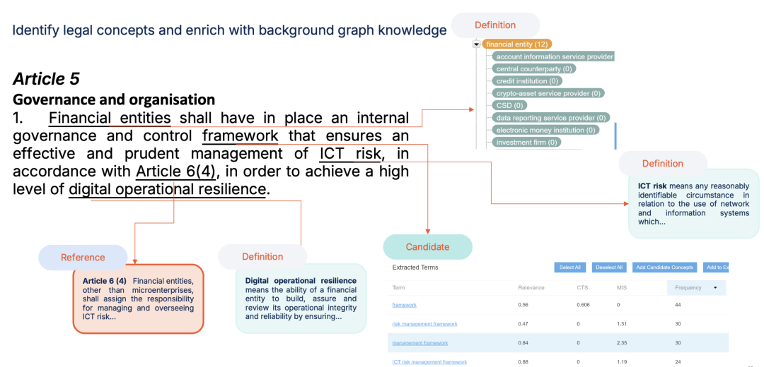 链接阶段:目标是识别法律概念并用背景图谱知识丰富它们。通过Graphwise工具,可以看到"金融实体"是描述12种实体的集合术语,这有助于理解您的组织类型是否被视为金融实体。系统会提供多个提取术语候选项并建议最可能的选项 。