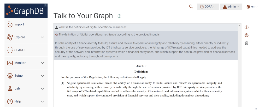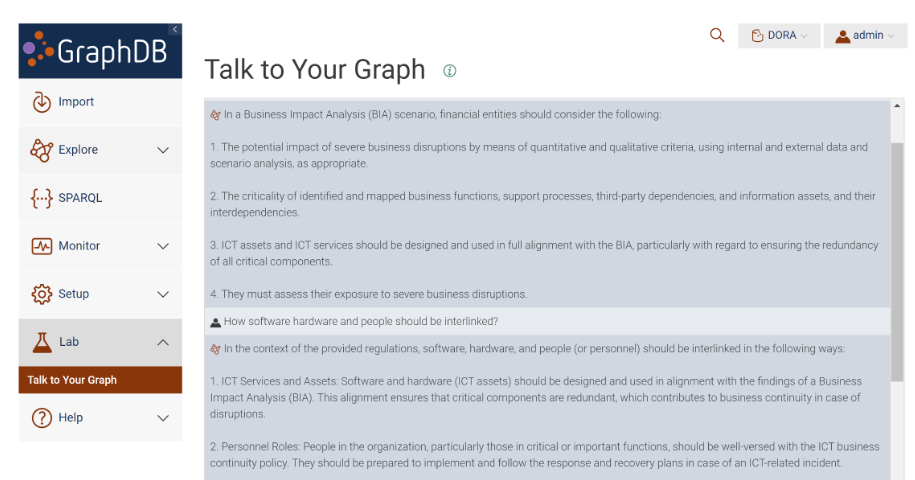 对话阶段:使用Graphwise GraphDB进行测试。当问及"运营韧性的定义是什么?"这个之前用于测试ChatGPT的控制问题时,结构化知识使我们能够从原始文档中检索到确切定义。甚至可以提出更复杂的问题,如"在这种情况下什么是业务影响分析?“或"软件、硬件和人员应该如何相互关联?” 。