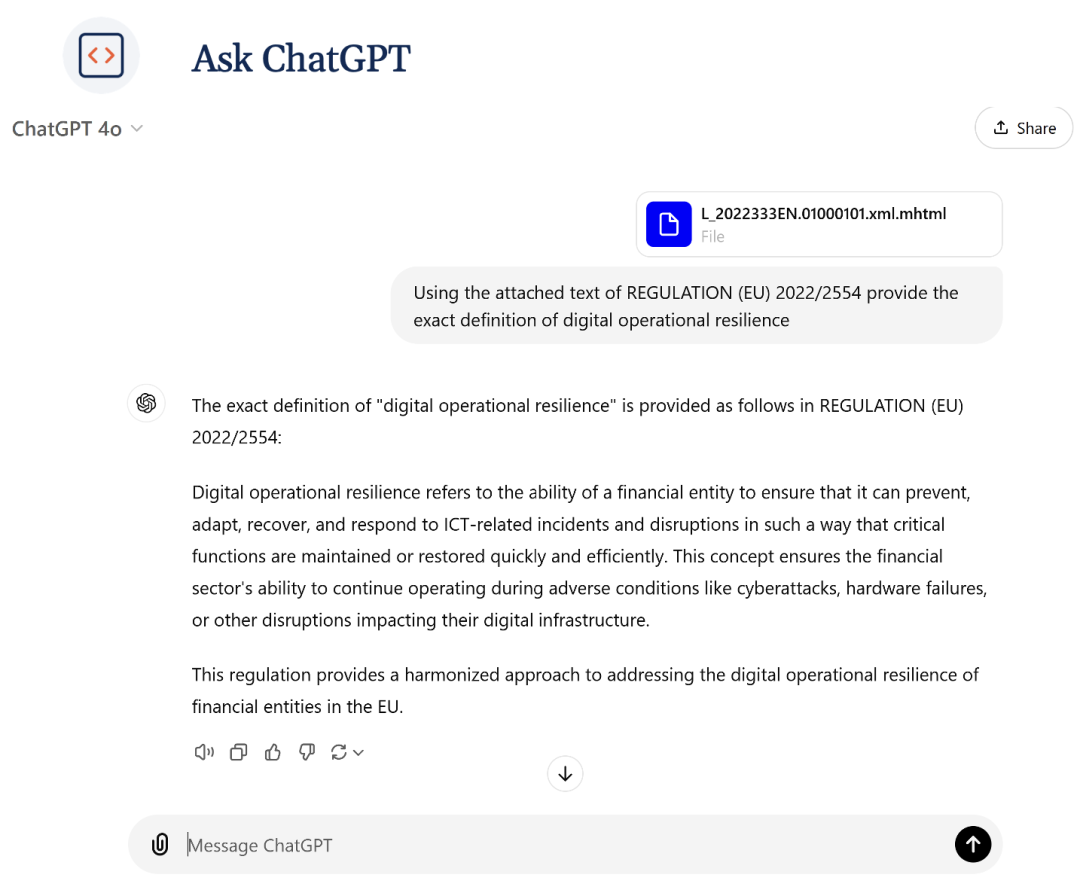 当我们尝试用ChatGPT回答DORA相关问题时,即使提供了完整的法规文本,其给出的答案不仅远离实际定义,而且存在危险的偏差 。这凸显了在法规合规领域,传统生成式AI存在的"幻觉"问题可能带来严重后果。