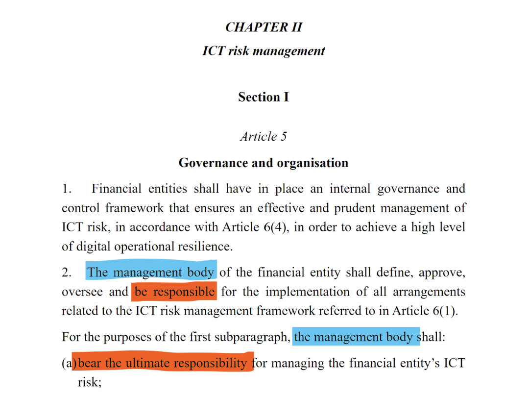 在DORA第二章第一节第5条关于ICT风险管理的条款中,明确规定管理层不仅仅是负责,而是对该法规要求承担"最终责任"。这意味着DORA现在是一项在所有欧盟司法管辖区直接适用的法规,并将ICT风险定义为"董事会级别的职责和优先事项" 。