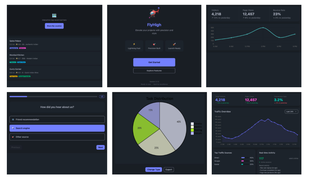 Dashboard showing Visitors: 4,218 (↗︎ 12% vs yesterday), plus a chart.