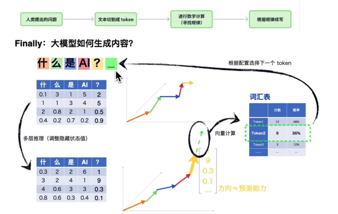补充:当大模型将每一个Token的概率算出来,选择具体输出那个Token的时候,我们可以限定Token选值的范围,也叫温度控制,比如(5%——10%)或者前10个里面随便选一个。