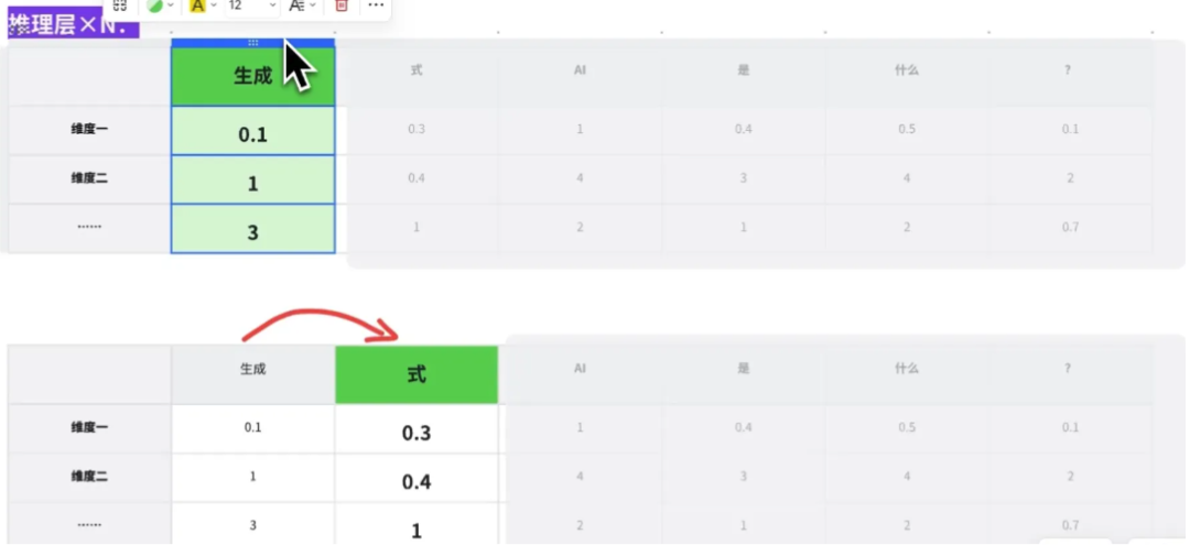 在完成上面的向量嵌入后会进入推理层,推理层自注意力机制对已标完号的Token与该词所在的位置和前后(生成式AI只能看前面的)和单词之间的关联关系使用自注意力层(transformer)架构进行参数调整,层层调整,直到把这句中的Token都调整完。