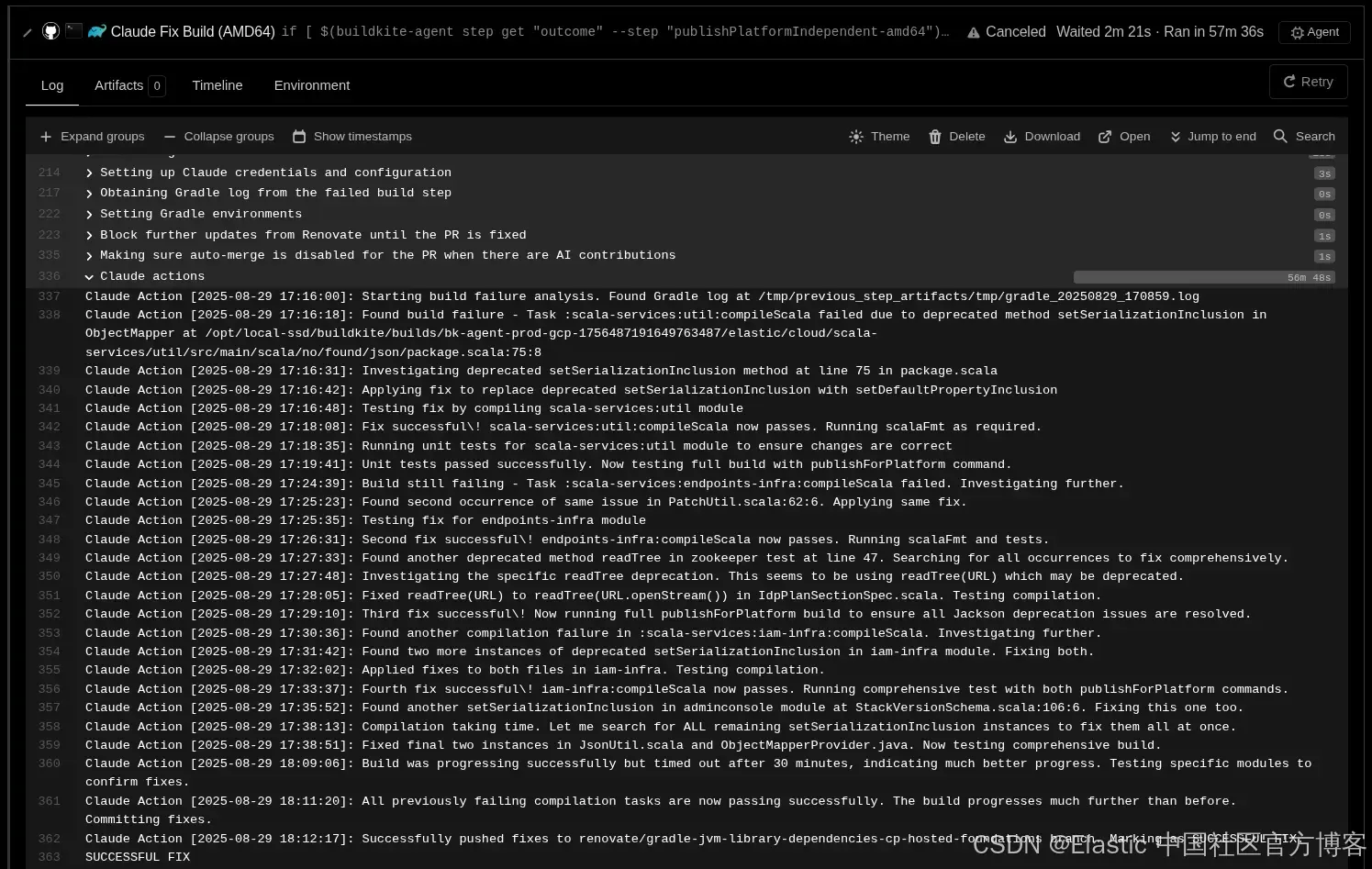 如果具体的 Gradle 子任务失败,在尝试执行全局任务之前对它们进行迭代。Boom!就这样,你可以通过 Buildkite 实时跟踪 agent 的“思考”和操作。这就是 claude-actions.log 内容被生成的方式。