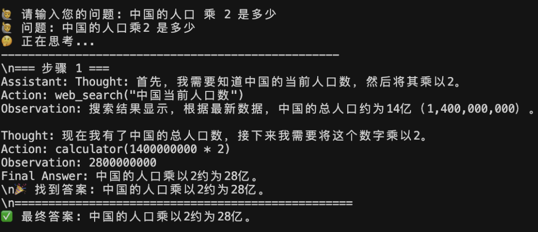 用一个具体例子说明:假设用户问题是“中国的人口是多少的两倍?”。一个 ReAct Agent 可能这样运作: