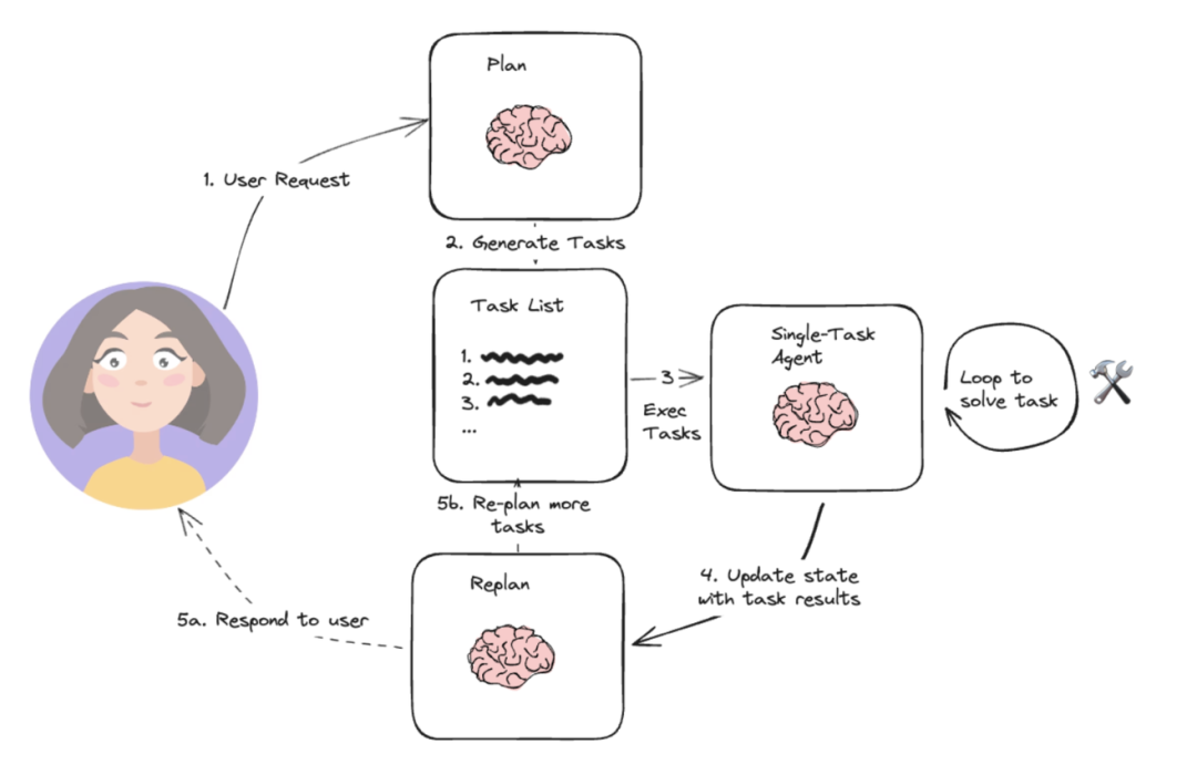 例如 LangChain 实现中,每一步的执行其实可以调用一个内部 ReAct Agent 来完成 (因为子任务本身也许需要检索或计算,多步才能得出结果)。