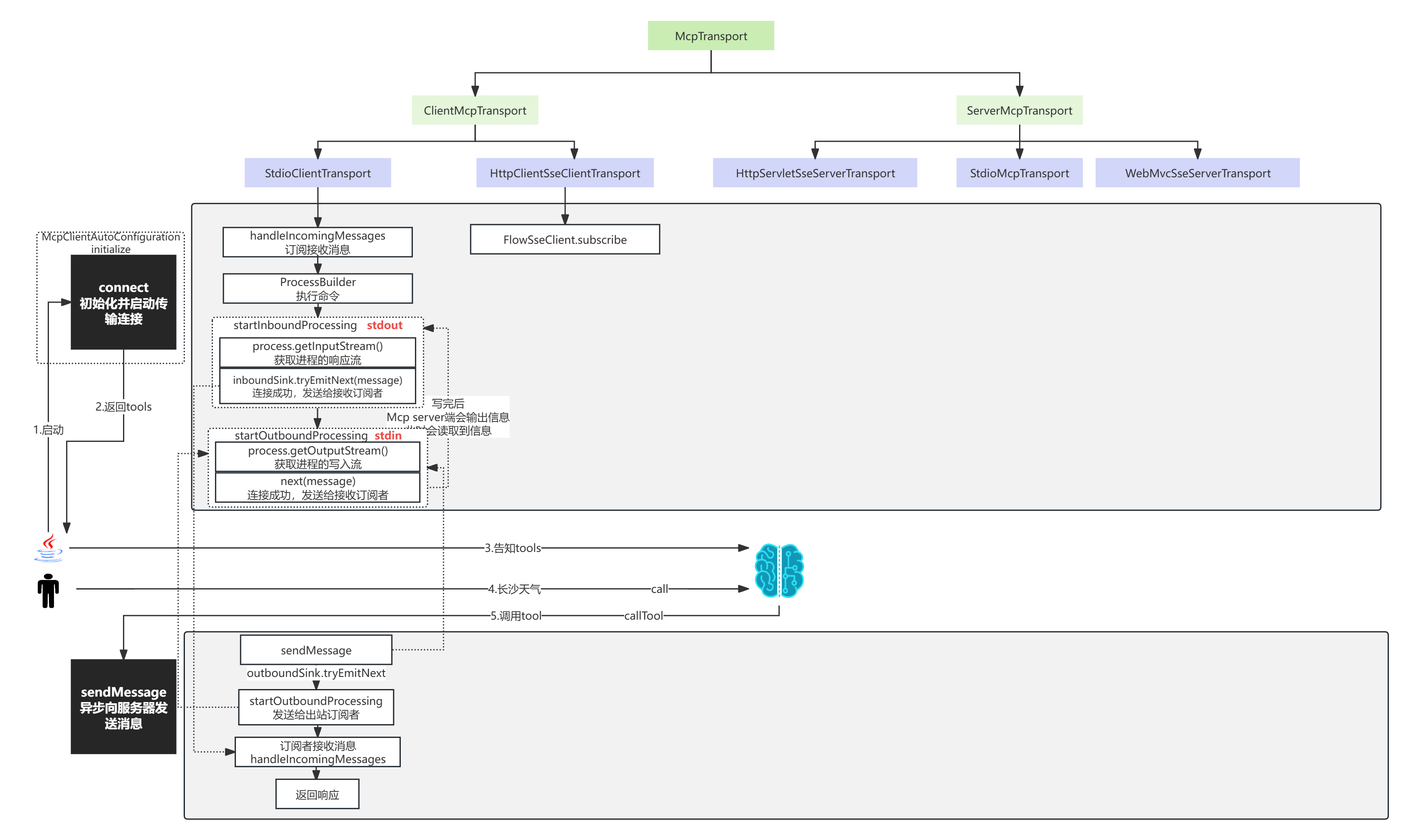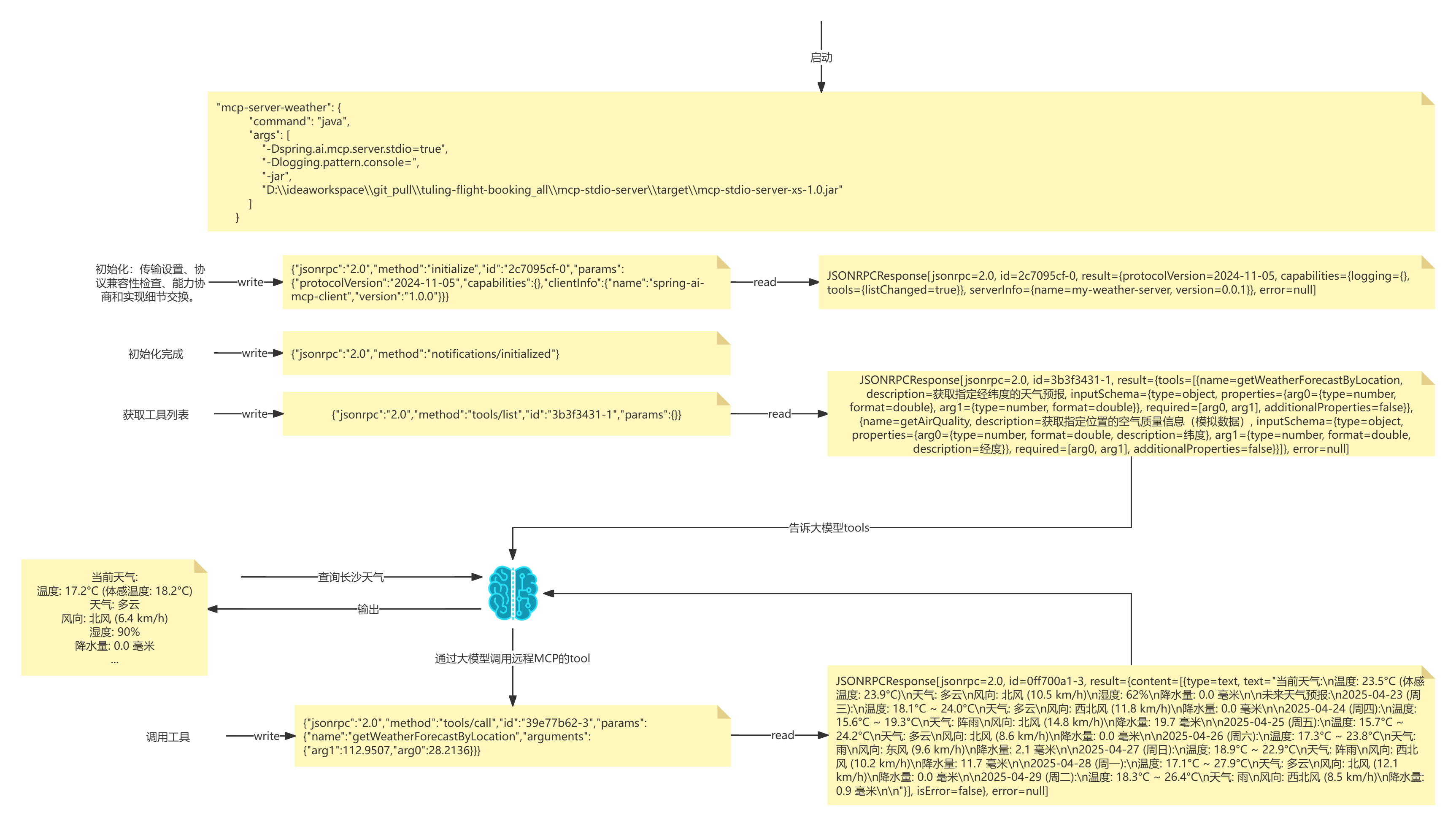 启动程序--->读取mcpjson--->通过ProcessBuilder启动命令---> 写入初始化jsonrpc---->写入获取tools列表jsonrpc---->请求大模型(携带tools)---->写入请求外部tool的jsonrpc---->获取数据--->发送给大模型---->响应。