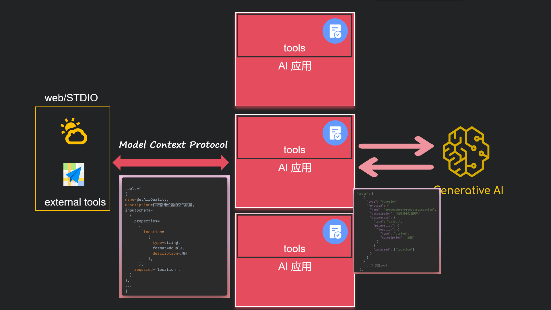 可以把tools单独抽取出来, 由应用程序读取外部的tools。 那关键是怎么读呢? 怎么解析呢? 如果每个提供商各用一种规则你能想象有多麻烦! 所以MCP就诞生了, 他指定了标准规则, 以jsonrpc2.0的方式进行通讯。