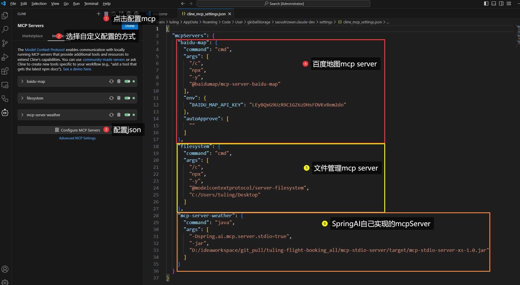 通常我们会配置一段json,比如这里的百度地图MCP Server :