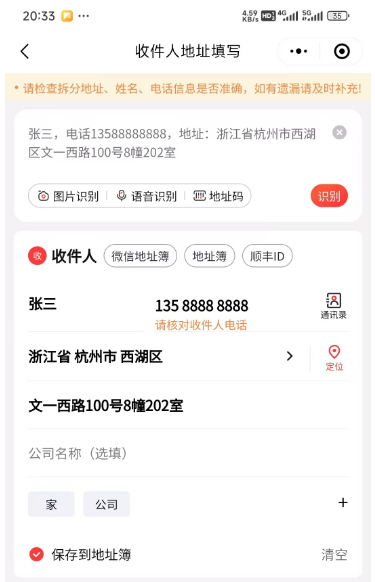 .user(<span style="color:#54790d">"收货人:张三,电话13588888888,地址:浙江省杭州市西湖区文一西路100号8幢202室"</span>)