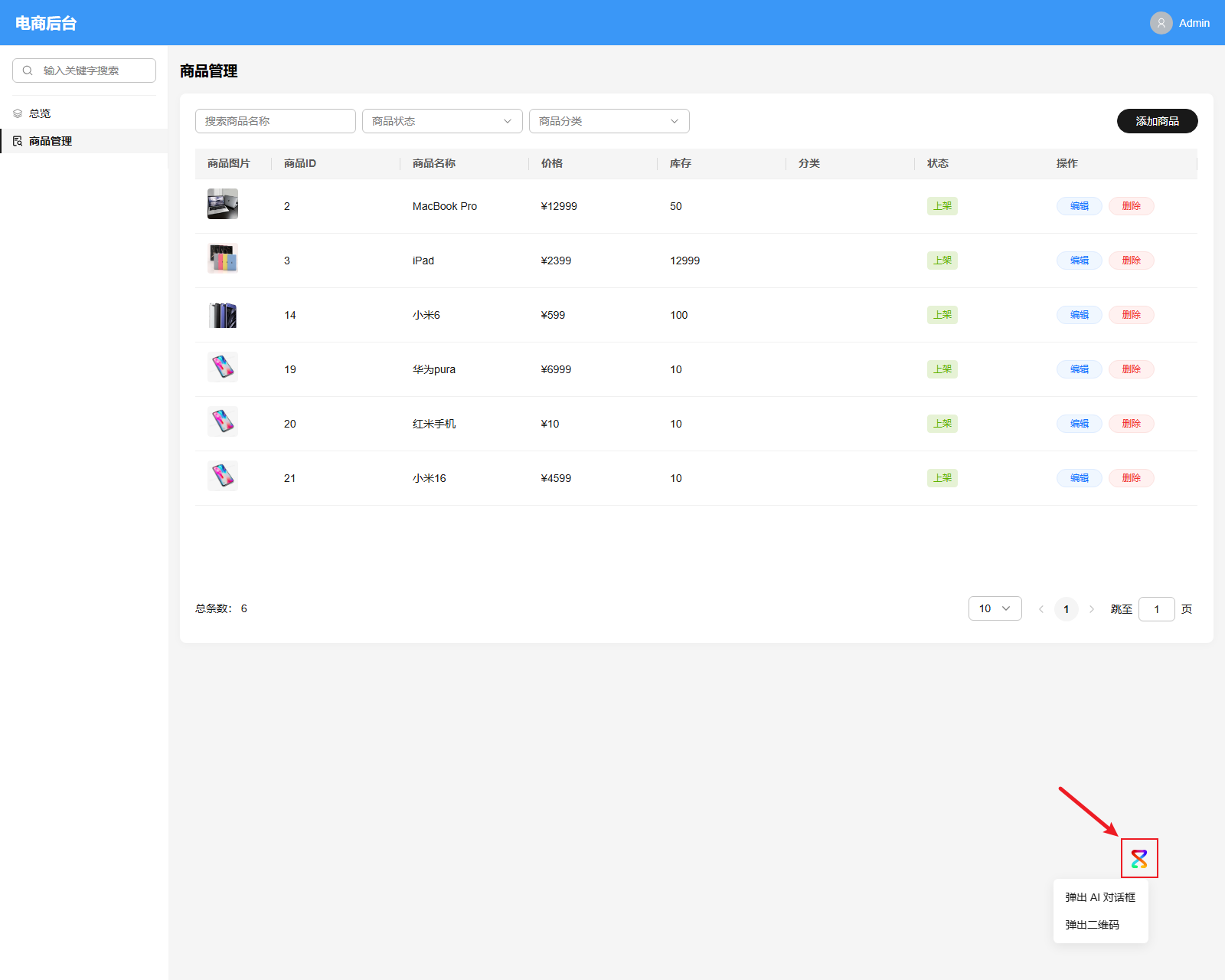 在输入框中输入需要操作的内容,例如:"帮我上架 10 台华为 Pura 70 手机",这时 AI 就会调用你的 Web 应用中定义的 MCP 工具,操作你的 Web 应用,完成商品的添加。