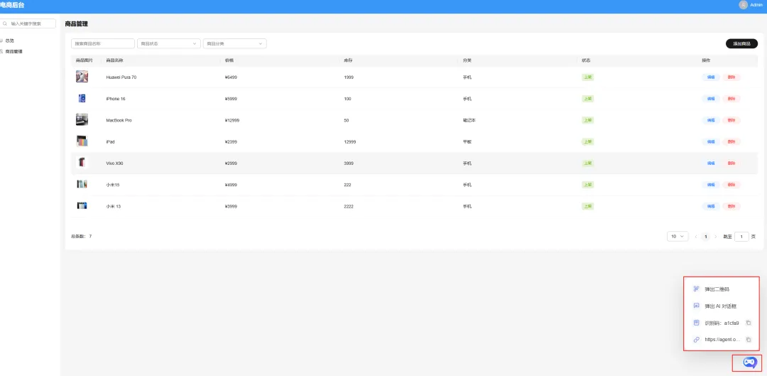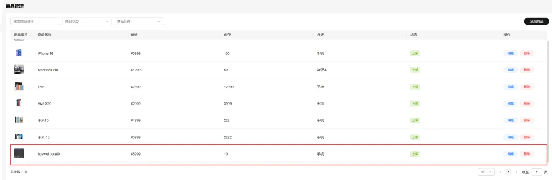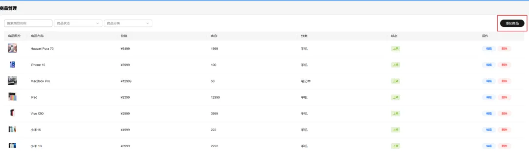 除了添加商品功能,还可以编辑和删除,因功能较为简单,此处不再赘述,开发者们可以根据自己的需求进行测试和二次开发。