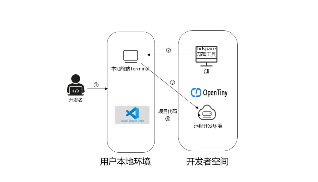 本案例中,使用华为云《本地 VSCode 基于华为开发者空间云开发环境完成小程序开发》的 "二。环境配置"、"三。本地 IDE 直连云开发环境完成上传下载" 的 "1. 下载 VS Code 并安装 Remote-SSH 插件"、"2. 连接云开发环境" 完成环境配置、创建云开发环境、开机、下载第三方插件 IDE、通过 CLI 工具连接本地和云开发环境的功能。
