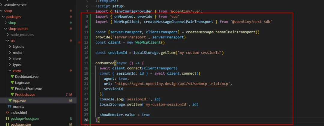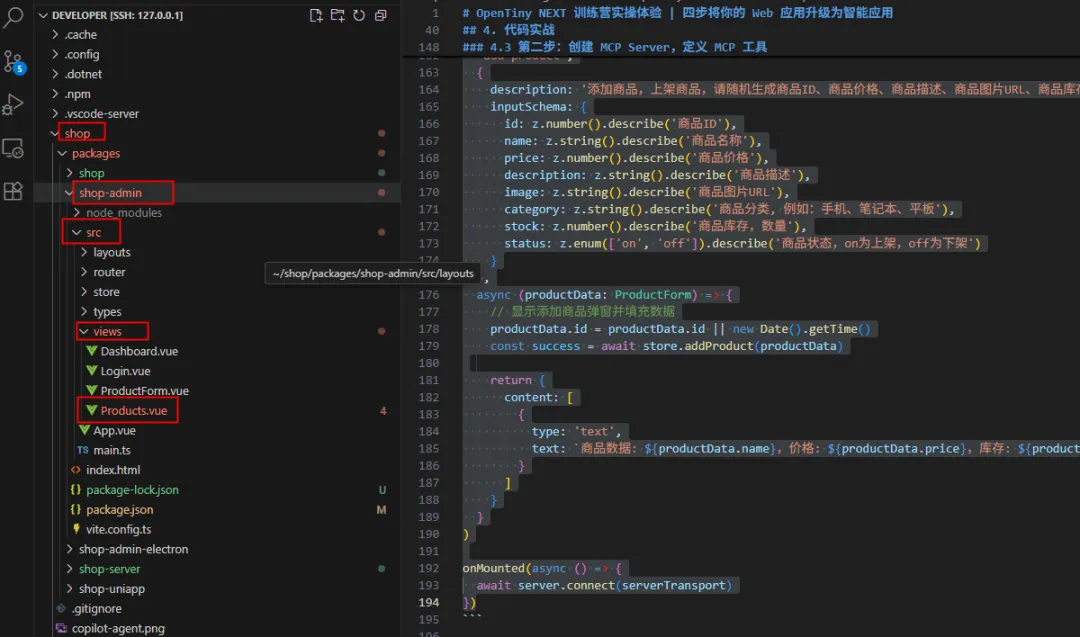 (1)创建 MCP Server 修改 Products.vue 在 shop->packages->shop-admin->/src/views/Products.vue 文件中加入以下代码: