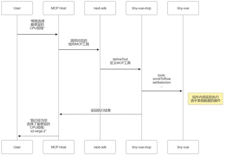 我们在 TinyVue 组件库之上封装了一套 MCP 工具,把常用的组件功能都做成了 MCP 工具,比如:在表格中插入数据、选中表格行、打开和选择下拉框数据等,让 AI 能够调用这些工具实现对组件的控制。