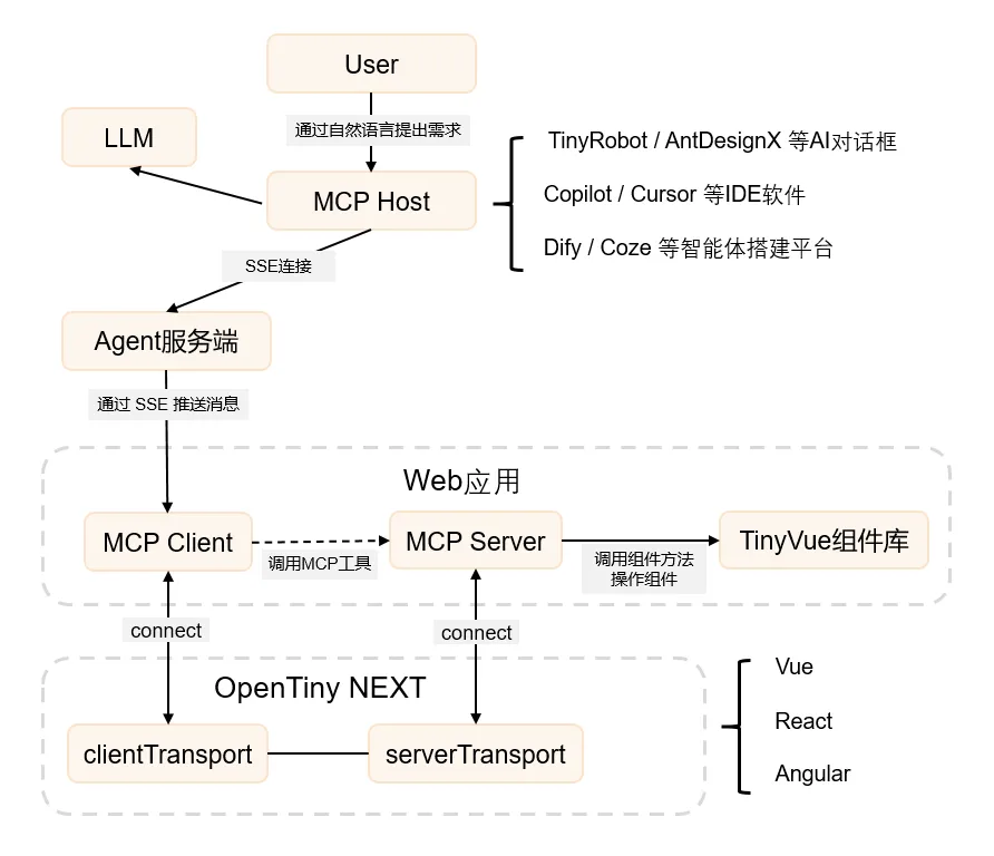 如果你的 Web 应用是使用 TinyVue 智能组件库搭建的,就天然包含了一系列方便 AI 操作页面的 MCP 工具,你只需要引入我们提供的 TinyVueMCP 软件包和 SDK 工具,连接我们提供的 Agent 服务,给你的 Web 应用补充必要的业务信息,就能被 AI 识别和操控啦。