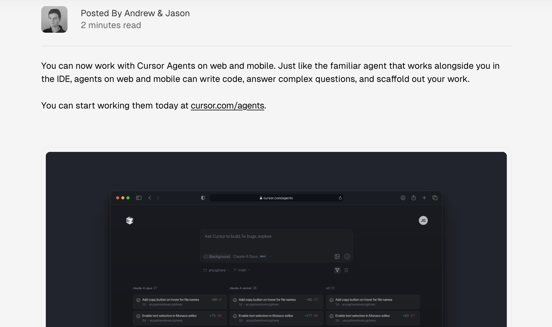 有了 Background Agent 远程编码代理,相当于 Cursor 给你提供了云服务器,在别人的电脑上帮助你完成发给 AI 的任务。而如果我手头没有电脑,我特么为什么要写代码啊?几天前,Cursor 官方宣布推出了网页版 AI 代理,手机上也能用,可以让 AI 帮忙回答问题、编写代码。点击任务,可以查看到完整的运行过程,跟客户端 Cursor 页面神似,还可以一键在客户端 Cursor 中