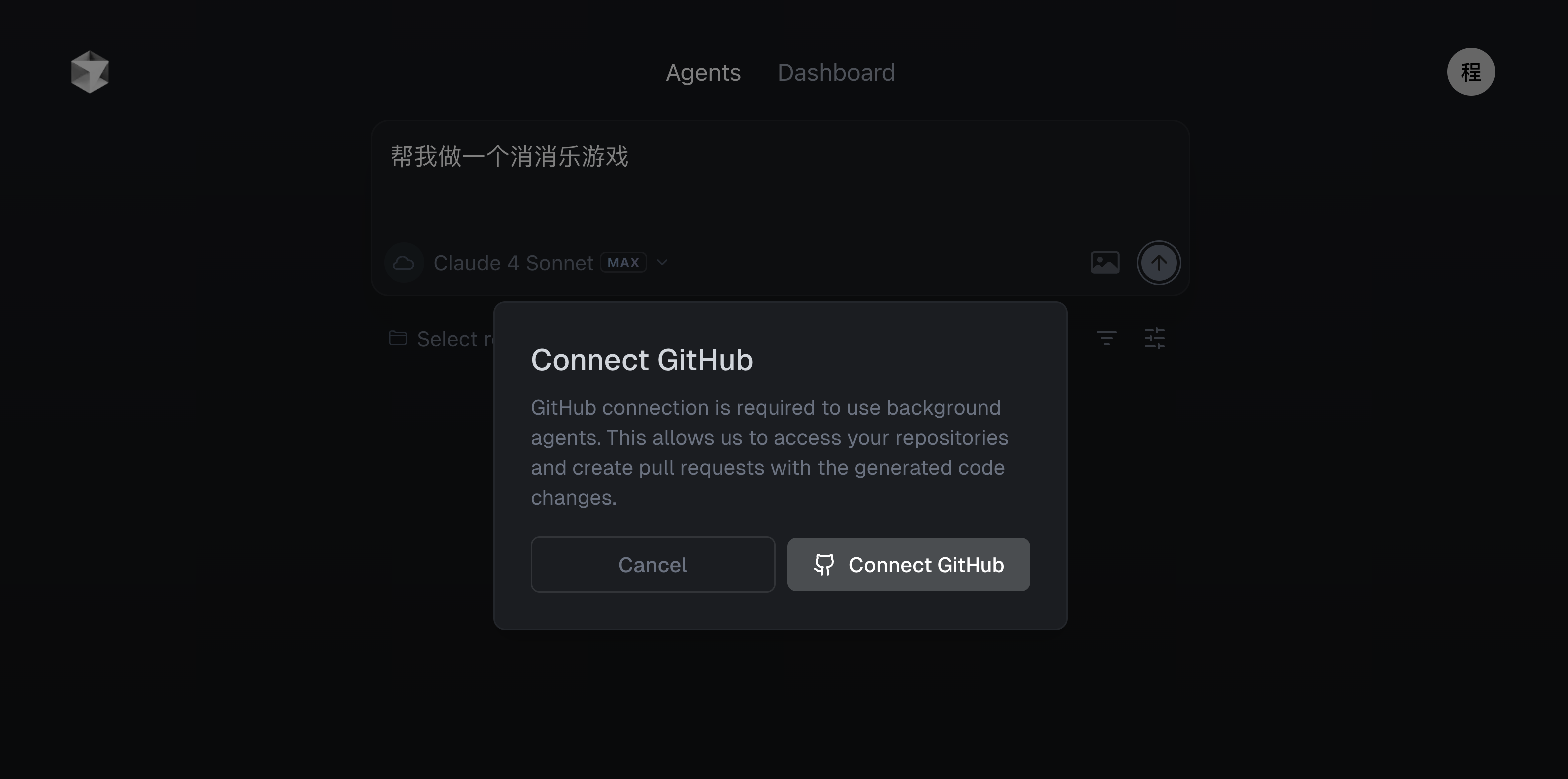 我们随便试一个提示词,让 AI 帮我做一个消消乐游戏,然后看到一个弹框,需要我们授权 GitHub。原因很简单,Cursor 网页版是依赖 Background Agent 实现的,需要访问我们的 GitHub 仓库来实现编码操作。
