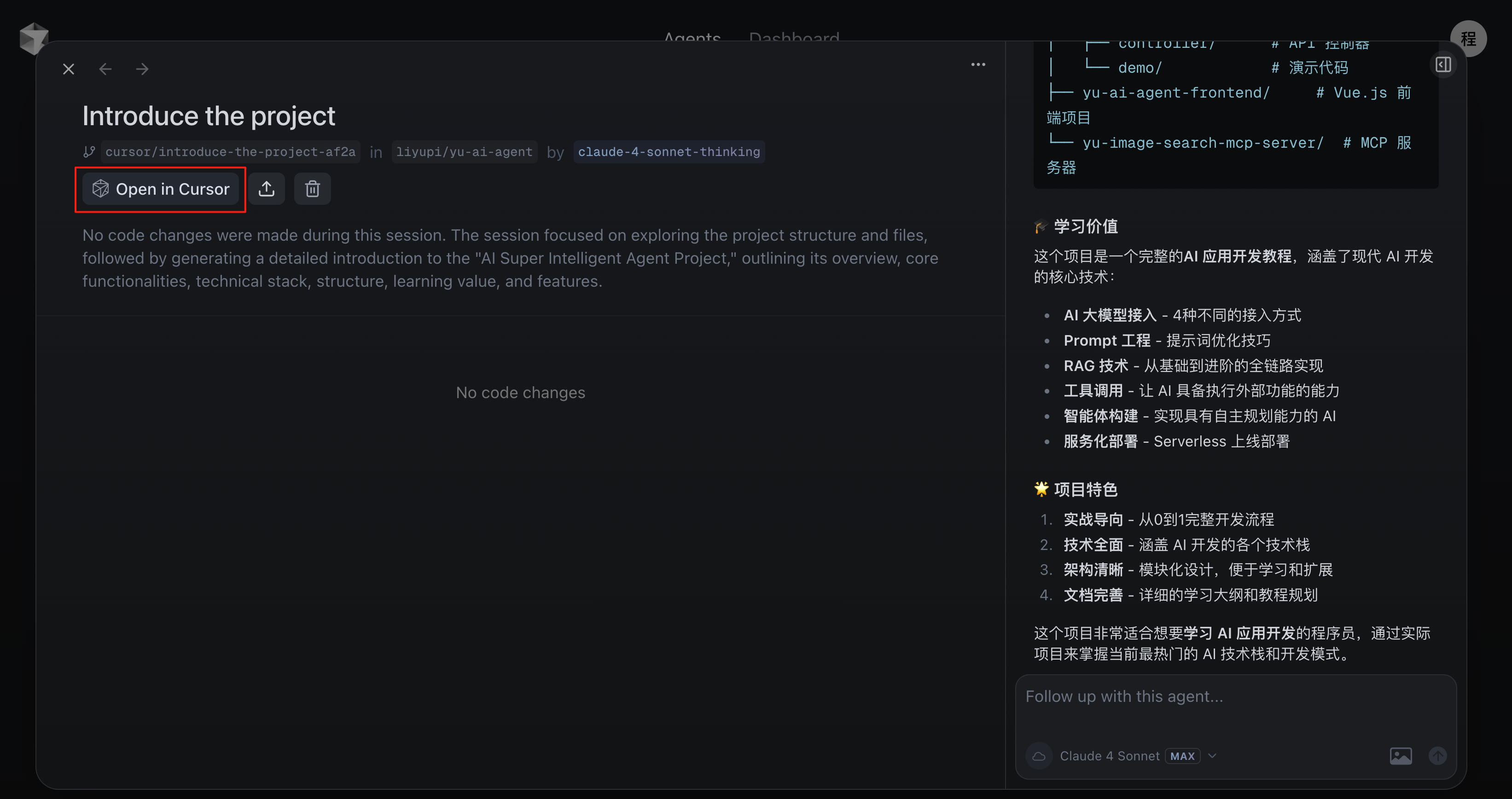 授权成功后,我选择了之前开源的 AI 超级智能体项目 仓库,让 AI 帮我介绍下项目: