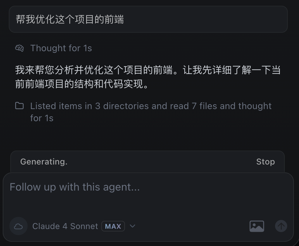 这里又有一个必须要注意的点,Cursor 网页版现在只支持 MAX 模型,而 MAX 模型会比普通的请求消耗更多的费用!估算下来,不开套餐的话差不多 0.3 元一次,这一步估计又劝退了不少人。。。