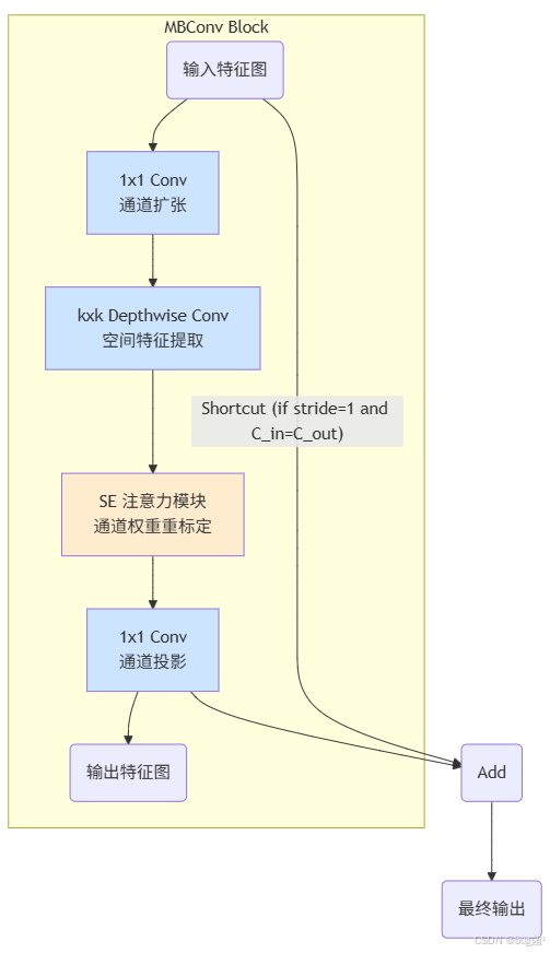下面是MBConv结构的Mermaid流程图,帮助你更直观地理解: