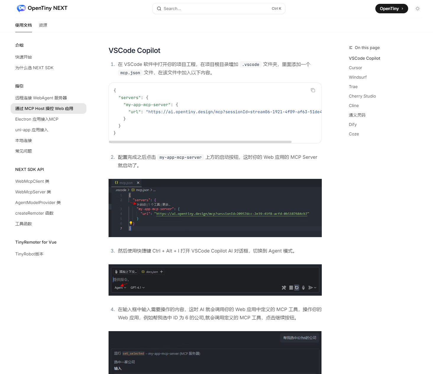 它的核心 SDK (包括 TypeScript, Python, Java 等版本),提供简化的 API 封装与 WebAgent 服务的连接、认证等逻辑,同时提供易用的 API 让开发者将企业应用的前端功能声明为 MCP Server。针对不同前端框架(Vue、React、Angular、Vanilla)特性,它提供 API 以降低用户在特定前端框架中的使用 MCP Server 和连接 WebAgent 的难度。