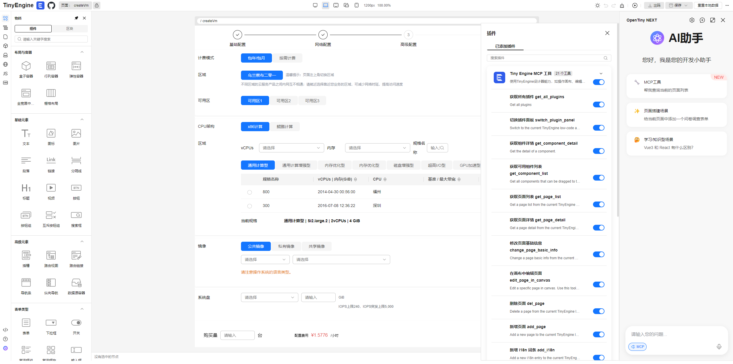 TinyEngine 智能低代码引擎集成 MCP 能力,支持自然语言或图片生成页面,并提供可视化手动编辑与 AI 智能优化双模式,帮助开发者快速构建应用。同时生成应用接入 OpenTiny NEXT,支持 LLM 直接操控,可助力企业应用实现智能化升级。