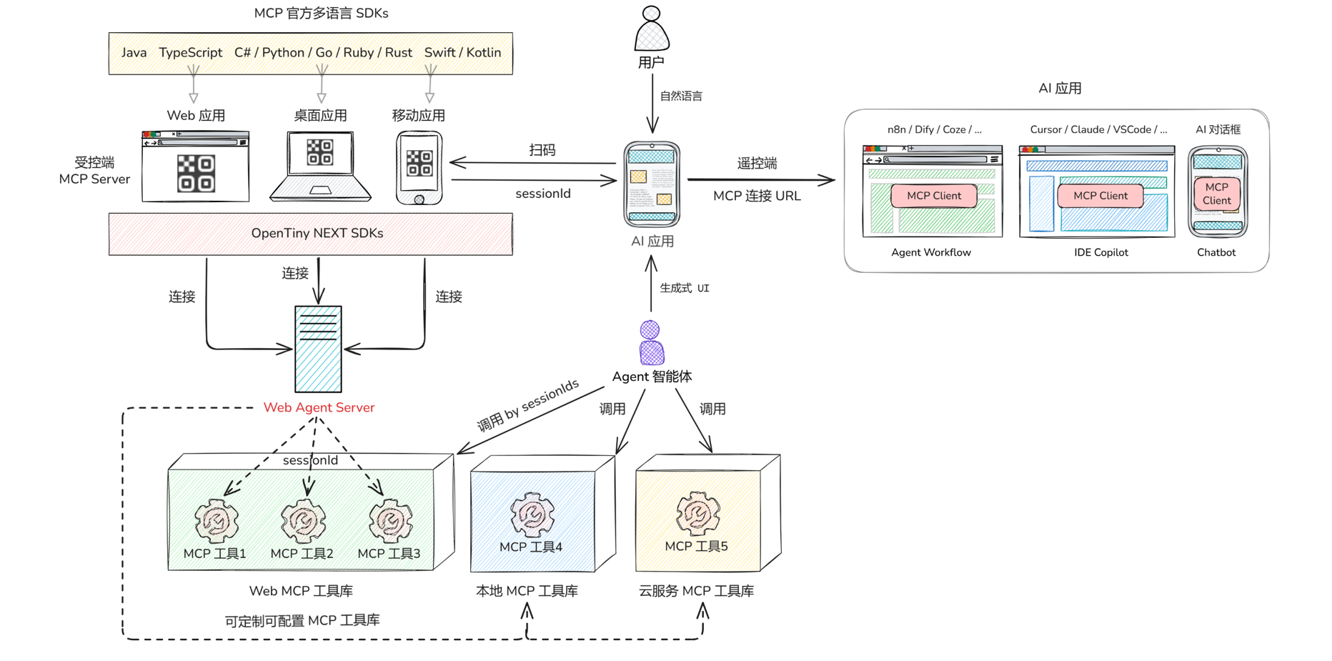 此外,它还提供一个适配器层,可以将任意前端 AI 对话框组件(包括 TinyRobot 组件)快速接入 WebAgent 服务。并且它支持抹平不同 LLM 差异,支持文字、语音等多模态输入,使得 AI 对话框连接的 LLM 支持受控端的 MCP 工具调用。另外,它还提供动态生成二维码功能,让企业应用里的 MCP 服务成为 AI 对话框里可以让 Agent 调用的工具。