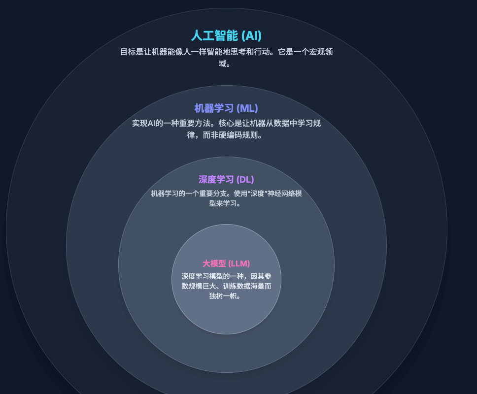 我们直接上结论: 简单来说,人工智能(AI) 是一个宏大的目标,即让机器像人一样思考。机器学习(ML) 是实现这个目标的一条主流路径,核心是让机器从数据中学习规律。深度学习(DL) 则是机器学习中一个非常强大的分支,它通过模拟人脑神经网络,实现了更强的自动学习能力。而今天我们热议的大模型(LLM),则是深度学习在规模化(海量数据、巨大模型)上取得突破性进展的产物,是当前AI技术的最前沿。它们的关系是层层递进的: AI ⊃ 机器学习 ⊃ 深度学习 ⊃ 大模型。