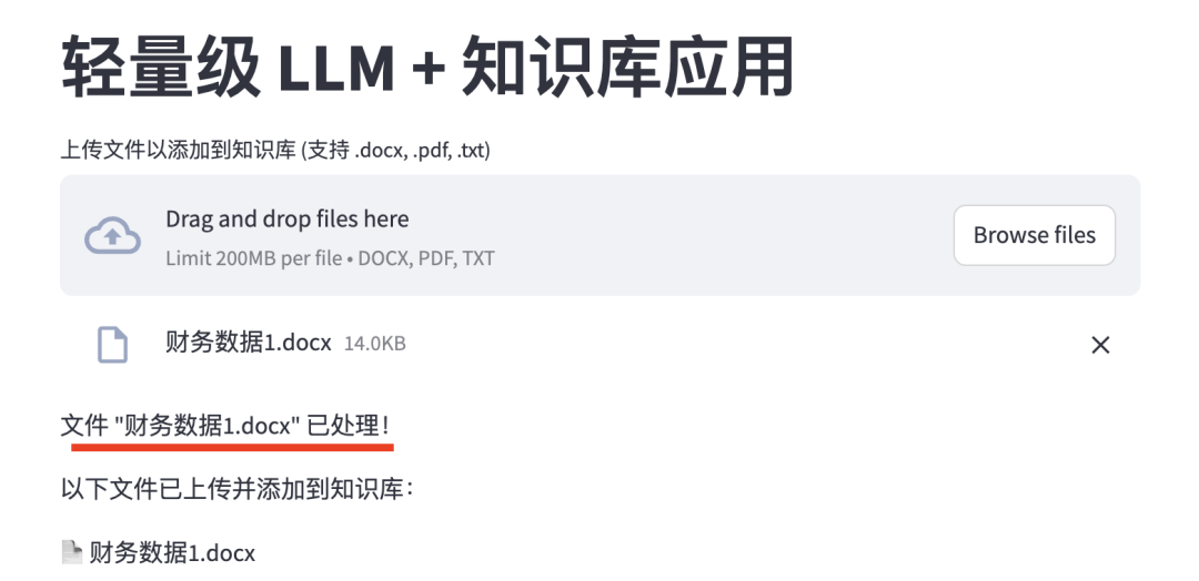 整体界面和使用demo如下所示,支持多个文件加载,包括PDF,docx等word文档和txt格式,每个文件最大支持到200M: