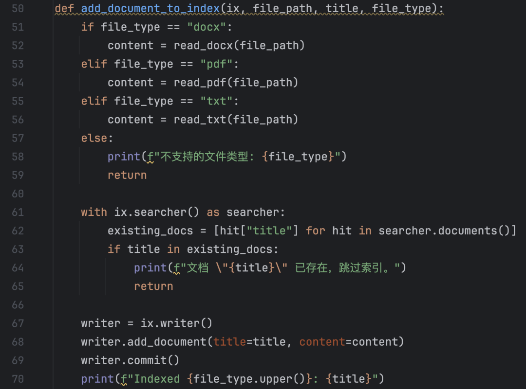 然后再把文档加入到whoose的索引库,代码如下所示,为后续本地检索提供基础文件数据,这就是我们的个人知识库: