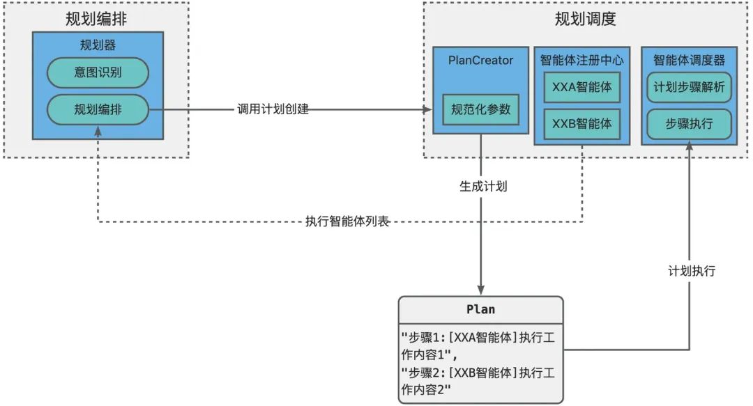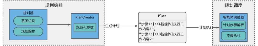 这里我可能着重关注规划编排如何被有效执行问题,即如何规范化规划编排内容。我们知道多智能体执行逻辑主要在两个模块,负责规划编排的规划器和实际执行的多智能体调度执行器。规划器规划编排生成对应计划Plan