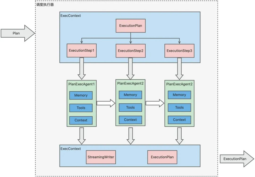 在调度执行阶段,调度执行器将对计划(Plan)中的规划步骤进行解析,并构建执行有向无环图(DAG)。计划步骤作为执行DAG中的执行节点,被分配到对应的智能体执行。鉴于计划步骤之间可能存在依赖关系,调度执行器采用串行方式调用智能体执行这些规划步骤。在智能体执行之前,会根据计划步骤的内容以及当前计划的整体状态,构建当前步骤的智能体执行请求。执行完成后,智能体会更新计划步骤和计划的整体状态,并将执行结果输出到流式输出总线StreamingWriter