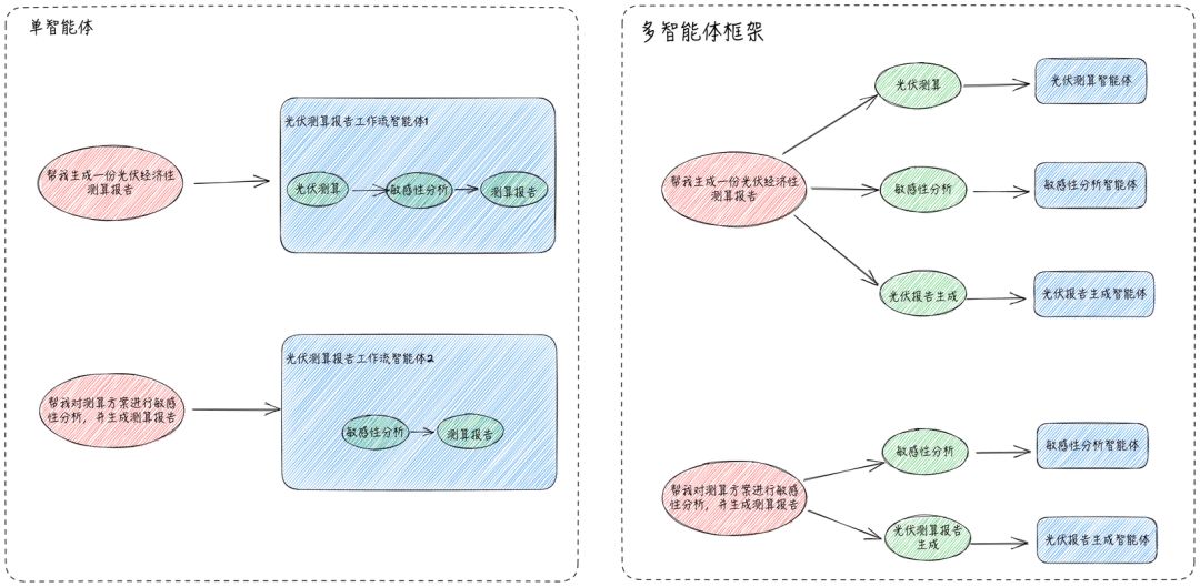 。用户输入可能是“帮我生成一份光伏经济测算报告”,或者是“我已经有测算方案了,对已有的测算方案进行敏感性分析,并生成测算报告”,此时单智能体和多智能体处理流程如下: